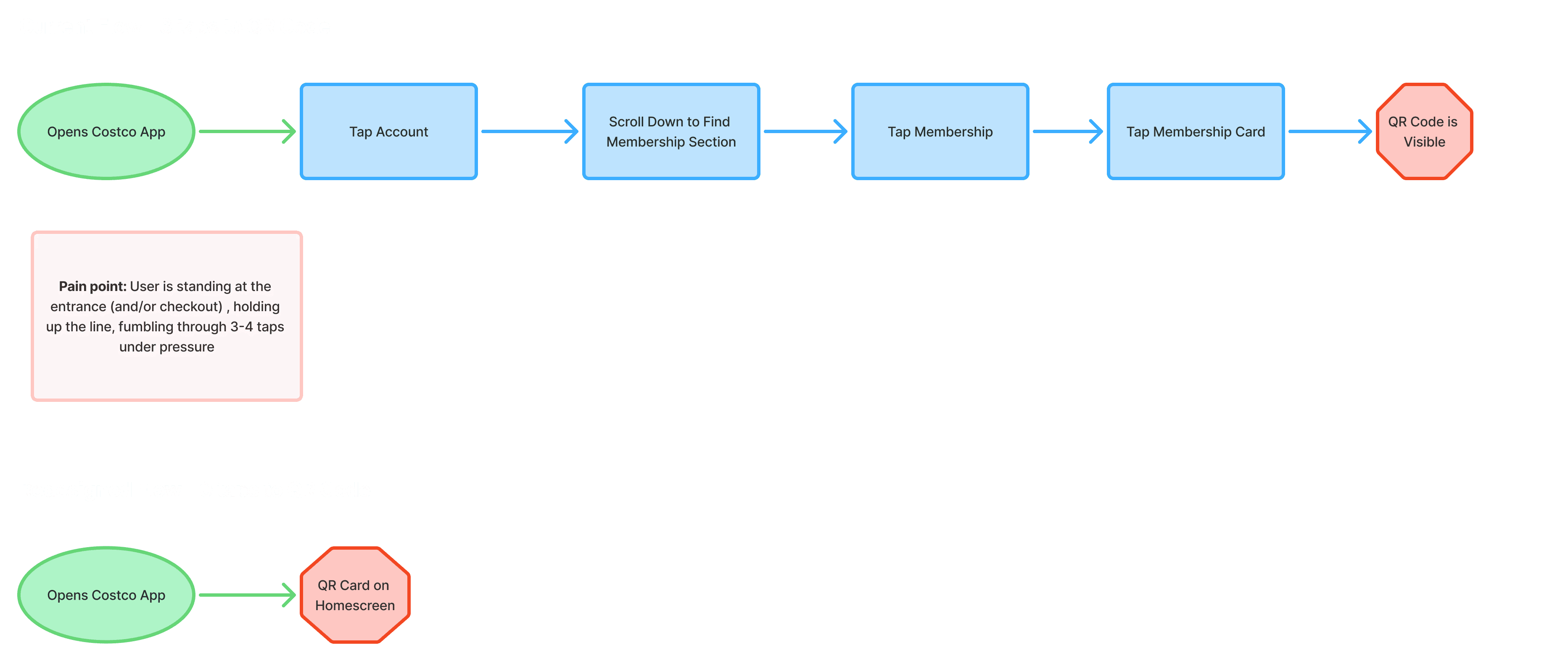 Costco's app buries its most used in store feature, the membership QR code, behind multiple taps, creating friction at the exact moment members need it most: standing at the warehouse entrance and for some locations checking out at the counter. The app is growing 40%+ in traffic. Yet the digital card, the one feature every in store member needs, is buried behind multiple taps on the homepage.