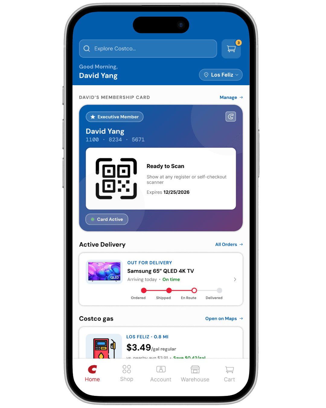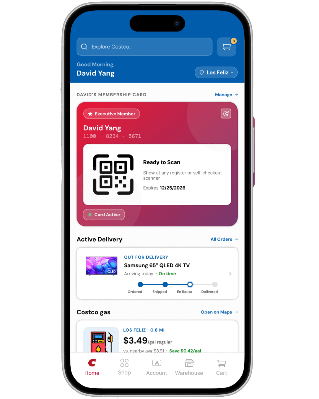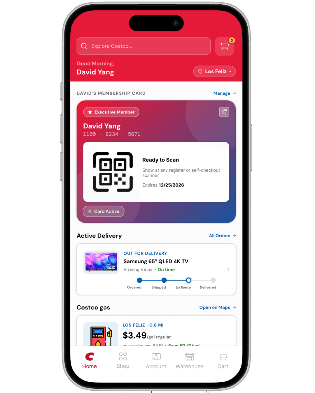 I recategorized the homepage around real usage priority: membership card access first, active delivery tracking second, Costco gas third. These three features account for the majority of intent driven app opens, yet none of them had meaningful surface area in the original design.