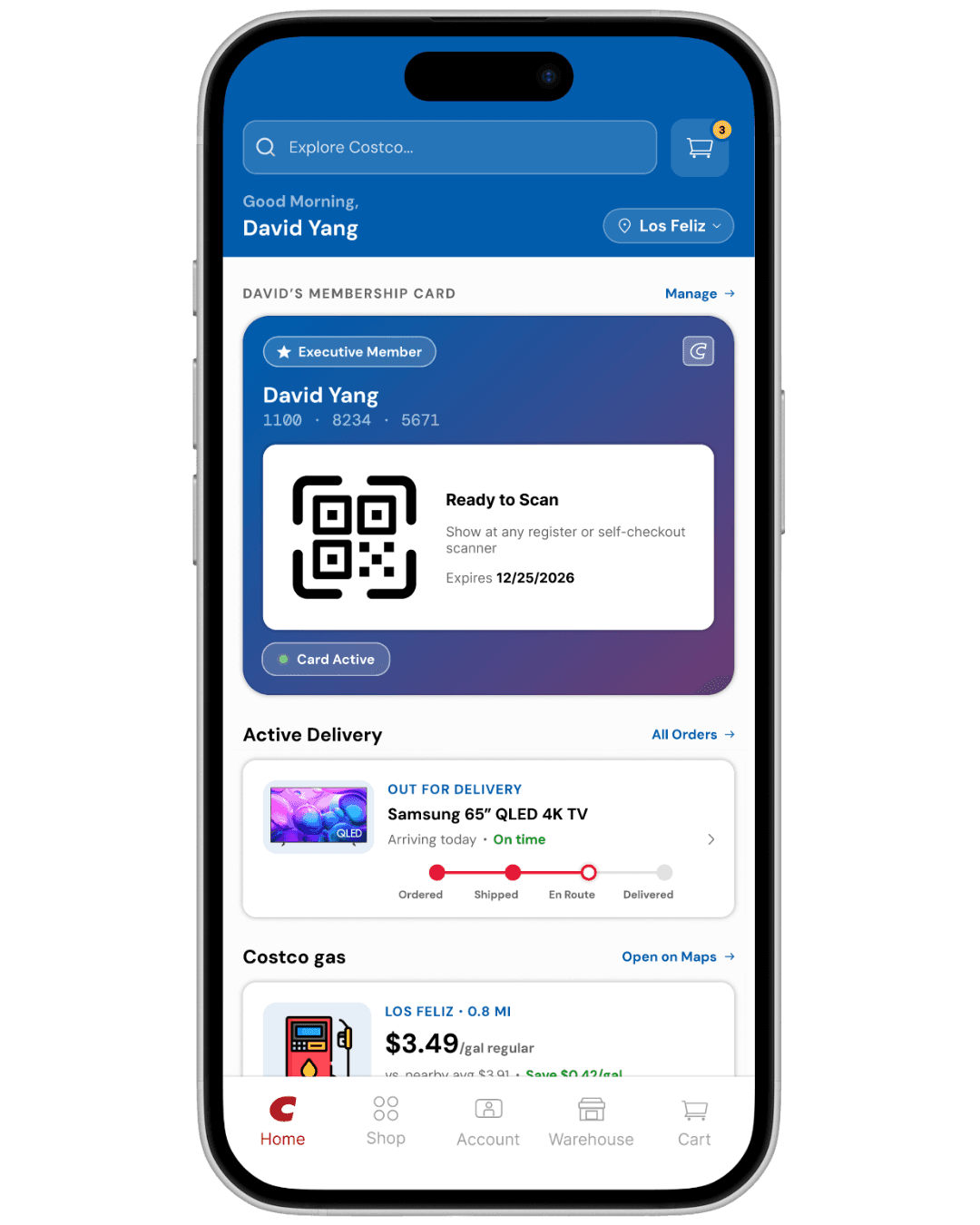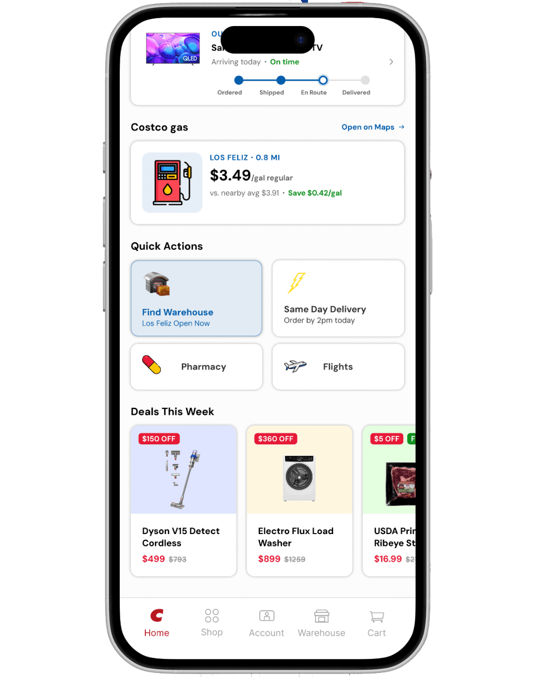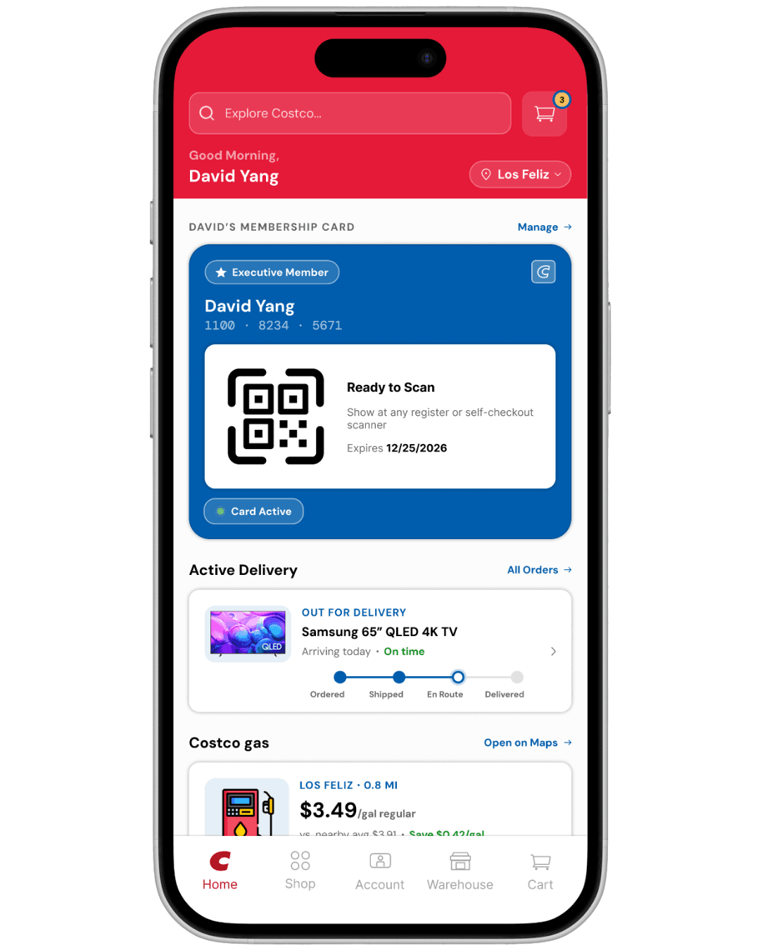 I recategorized the homepage around real usage priority: membership card access first, active delivery tracking second, Costco gas third. These three features account for the majority of intent driven app opens, yet none of them had meaningful surface area in the original design.