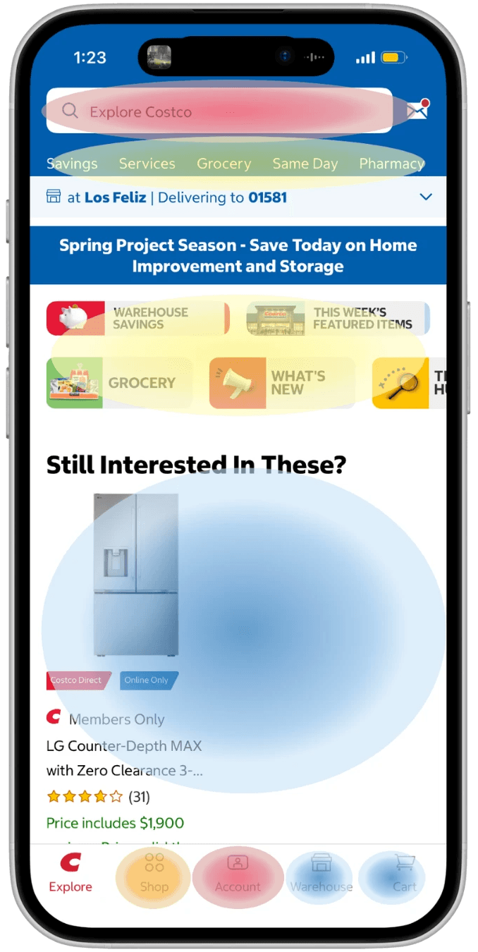 The redesign was also informed by heatmap data. The existing homepage was organized around category sections — Savings, Grocery, Same Day, Travel — that showed consistently low tap density. Members were scrolling past them, not through them. This confirmed that the homepage wasn't actually serving the most common reasons people open the app.