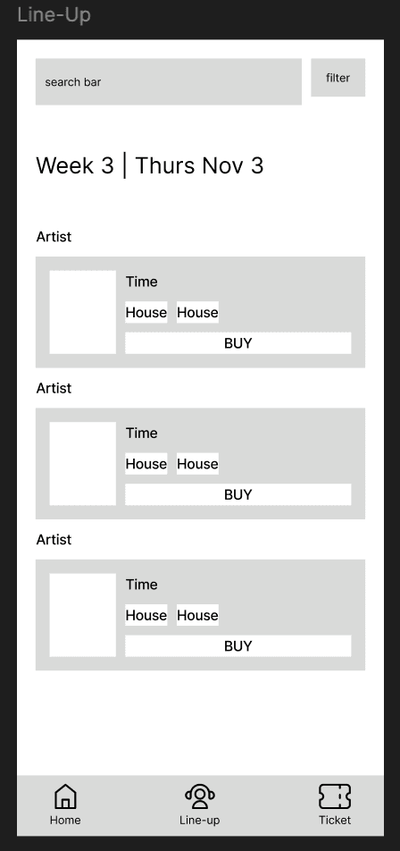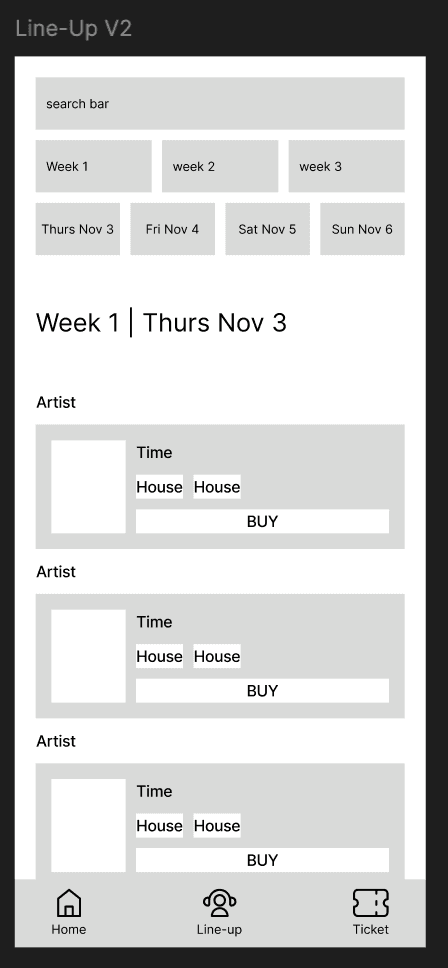 1 version had a filter bar, and the second version laid out the different weeks and days into buttons so all they have to do is click on the respective times they want to browse for the artists. After A/B testing with the same participants, users preferred Lineup V2 due to its intuitive design. They found it "easy to use" and "simple and direct".
